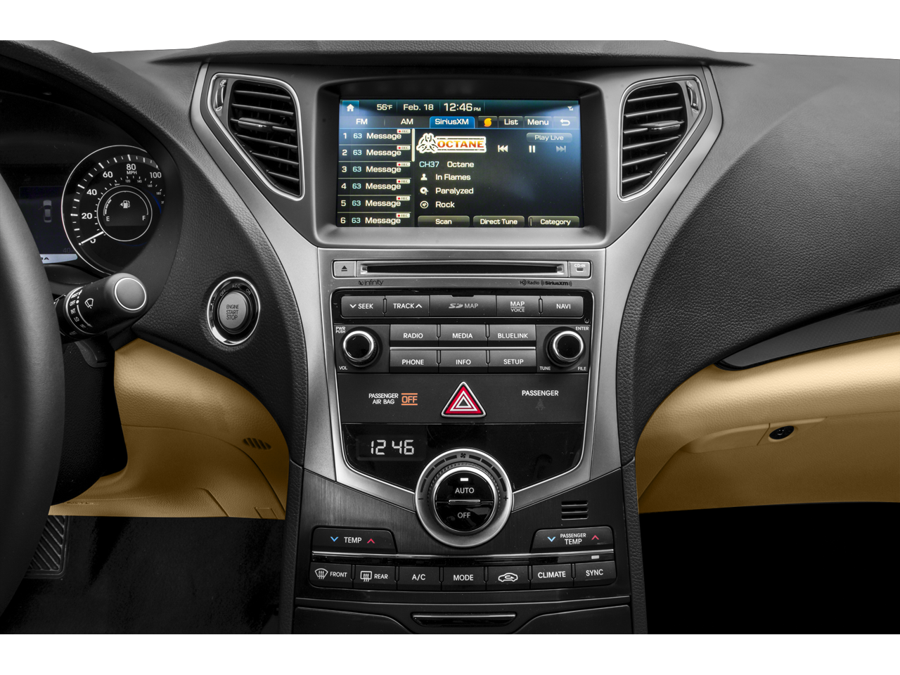 - Radio: AM/FM/SiriusXM/CD/MP3 w/Navigation System -inc: 8-inch touchscreen (AVN 4.5), 14-speaker Infinity Logic 7 surround sound audio system (550-watt), album cover art, iPod/USB and auxiliary input jacks, HD Radio w/multicasting, SiriusXM TravelLink (complimentary trial), Blue Link Telematics (Gen 2), and Bluetooth® w/phonebook transfer